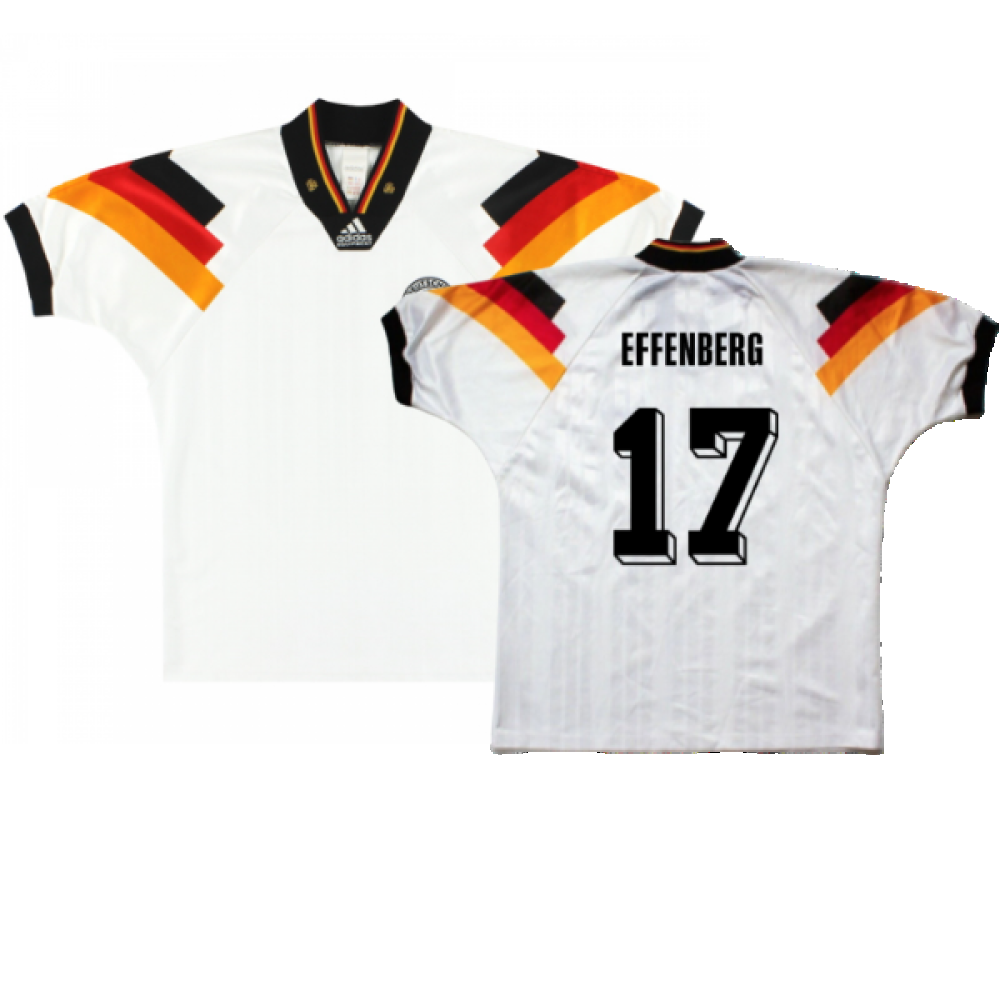 The Germany 1992-93 Home Shirt as worn by players such as Voller, Brehme, Kohler and Klinsmann as the team reached the final of Euro 1992.