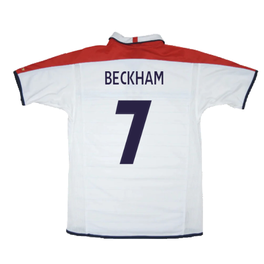 England 2003-05 home top as worn by Beckham, Lampard, Rooney, Hargreaves and A.Cole as the team competed in the 2004 Euros. England made it to the quarter finals, only to be knocked out on penalties by Portugal.